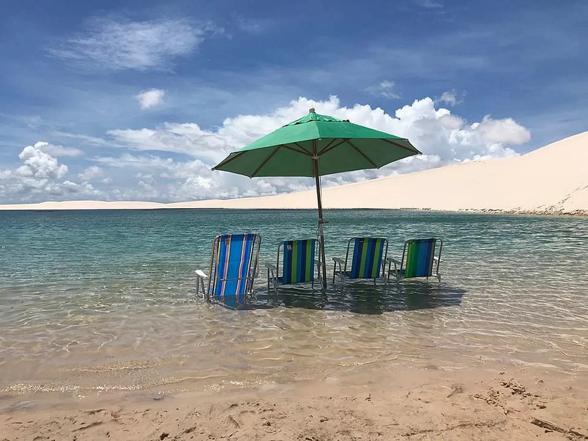 Após o café da manhã, tour off-road às Lagoas Paraíso. O colorido vibrante do lugar remete aos paraísos caribenhos: areia fina e extremamente branca se confunde com o verde da vegetação rasteira e dos coqueiros, que por sua vez emolduram o azul turquesa da água cristalina.
